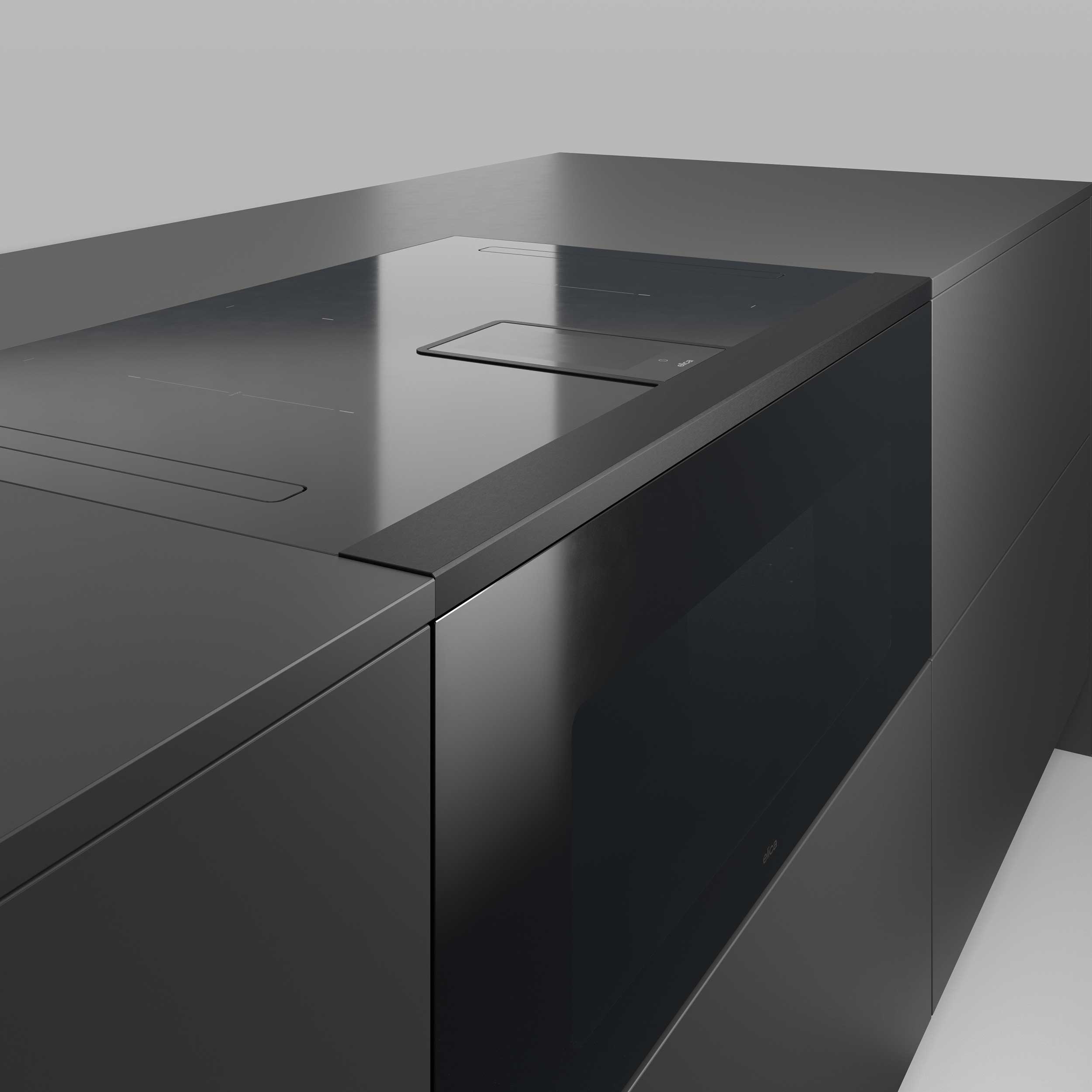 Frontprofilsett for planmontering (30 mm) gir en sømløs og stabil tilpasning mellom benkeplate og LHOV. Den mørke finishen matcher produktets glassdesign.