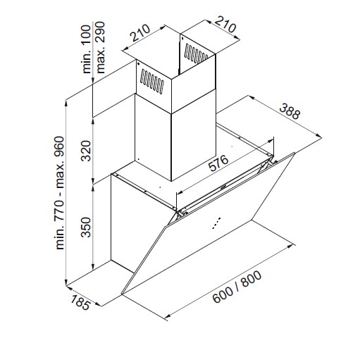 - Virkelig lekker skråstilt kjøkkenvifte med en overflate i syrebehandlet glass => silkemyk overflate
