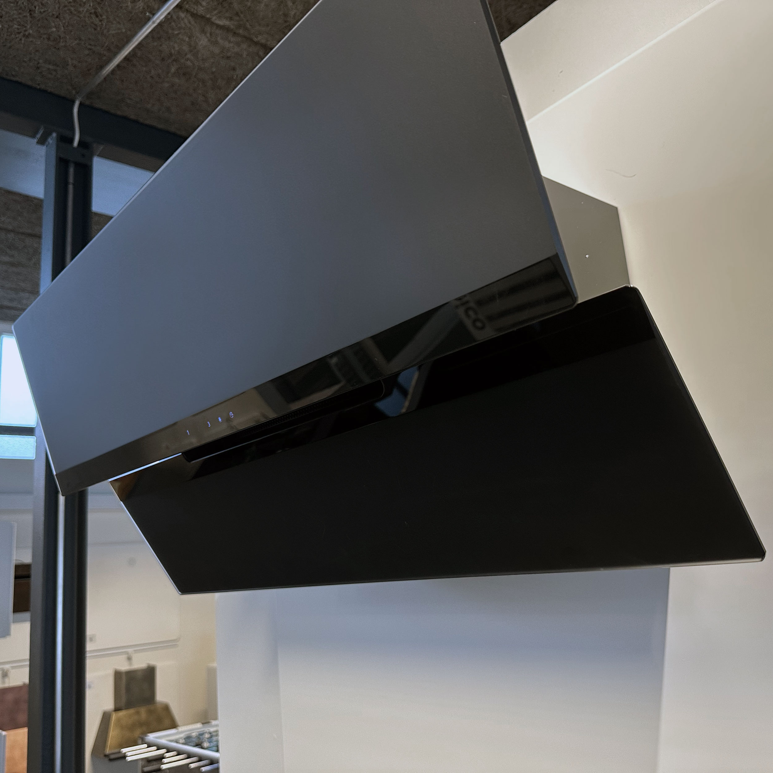 Veggmontert hette, skråstilt. Med innebygget motor - Sort glass/matsort liste - 595 mm - A++